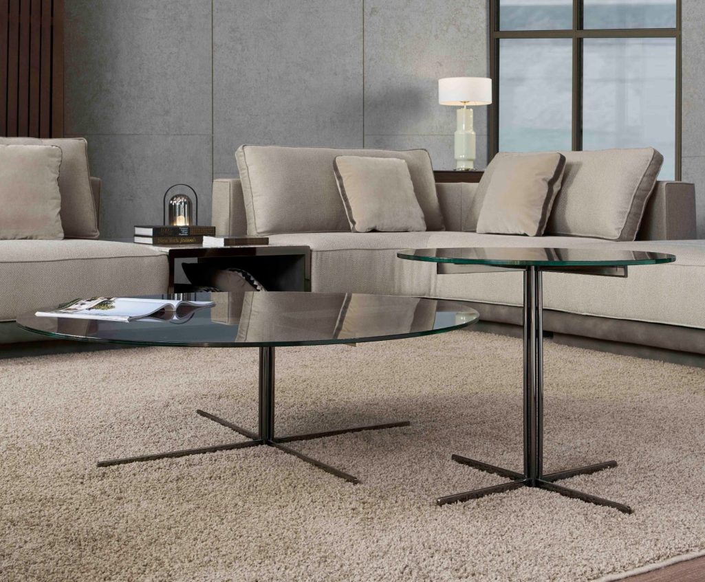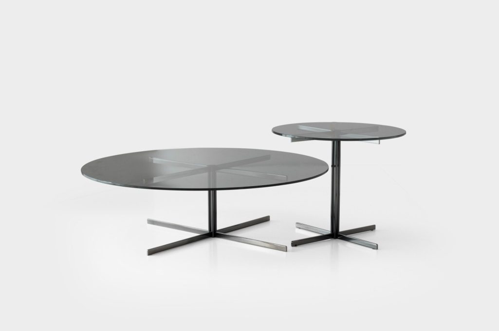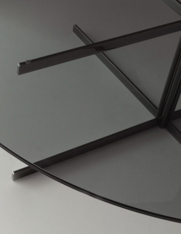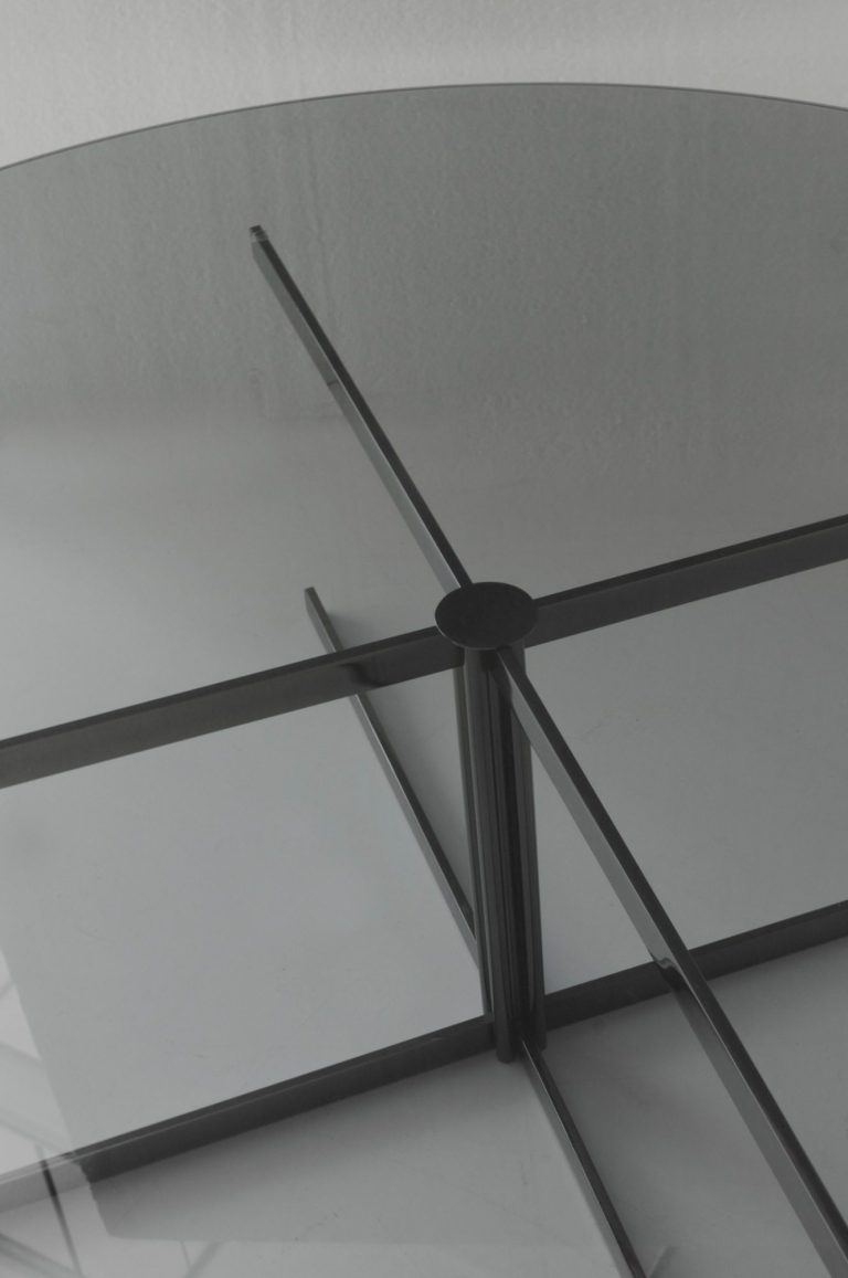 Caracterizada por sus finos espesores y fina estructura, la tapa de cristal apoya sobre una base en forma de cruz de pletinas de metal que intersectan en las varillas centrales.